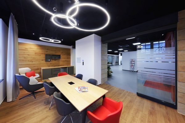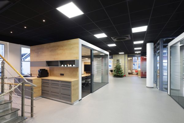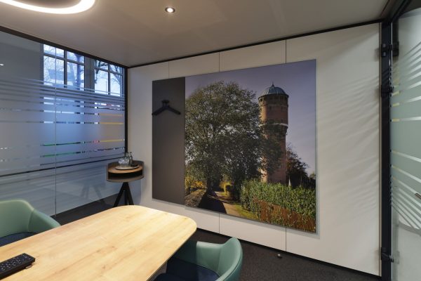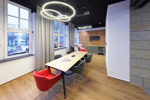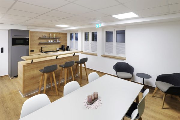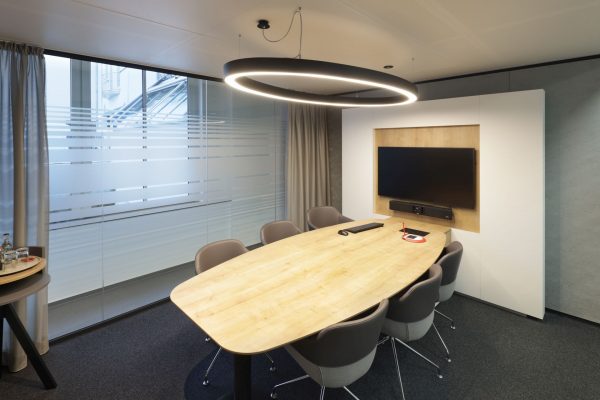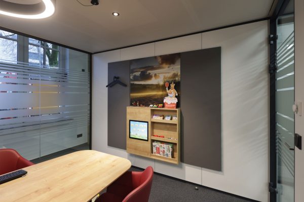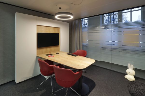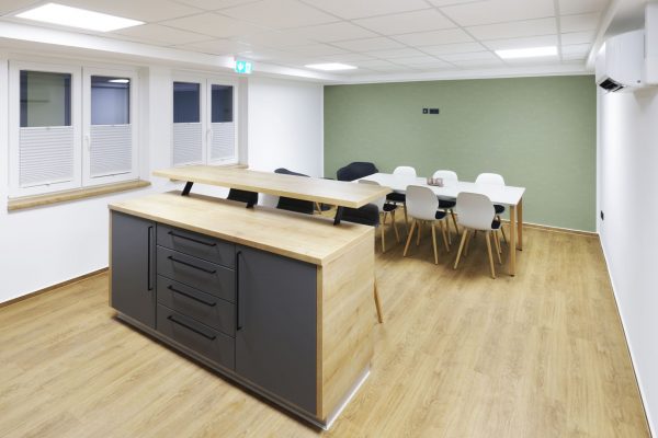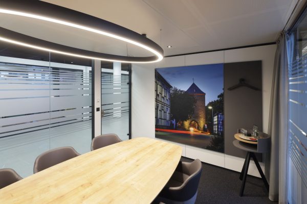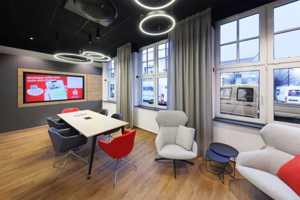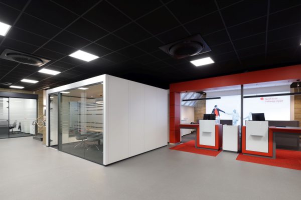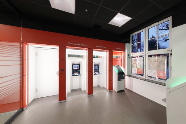 Das Design folgt dem Leitgedanken des „Treffpunkt Sparkasse“: warme Materialien, Glasflächen und natürliche Beleuchtung schaffen ein freundliches, einladendes Ambiente. Individuell gestaltete Beratungskuben bieten Rückzugsmöglichkeiten, während das offene Foyer den Dialog fördert.