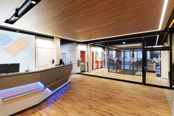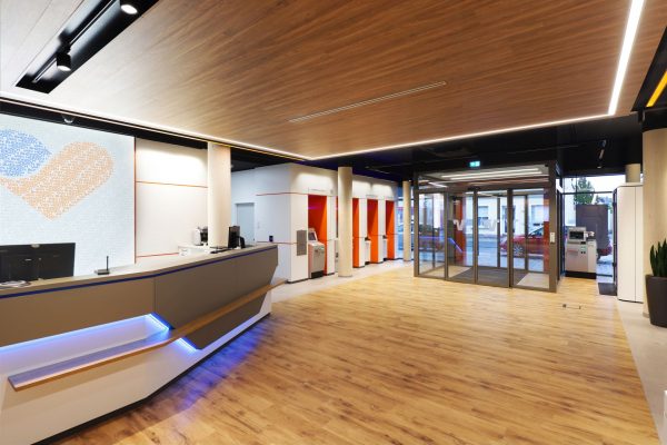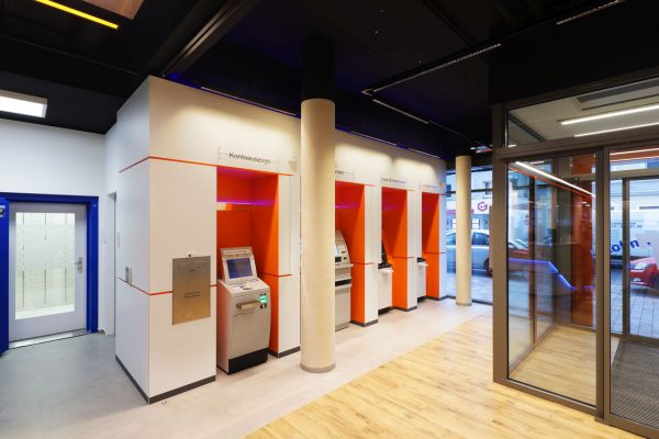 Für das Masterdesign wurden Kranz & Partner beauftragt – von der Analyse der Kunden- und Mitarbeiterbedürfnisse über kreative Workshops bis hin zur Entwicklung eines flexiblen Gestaltungsbaukastens für Möbel, Beleuchtung, Farben, Materialien und Raumaufteilung.
