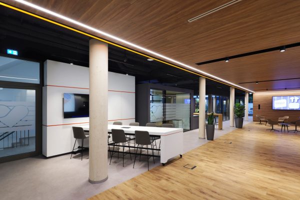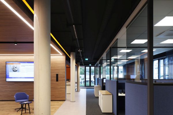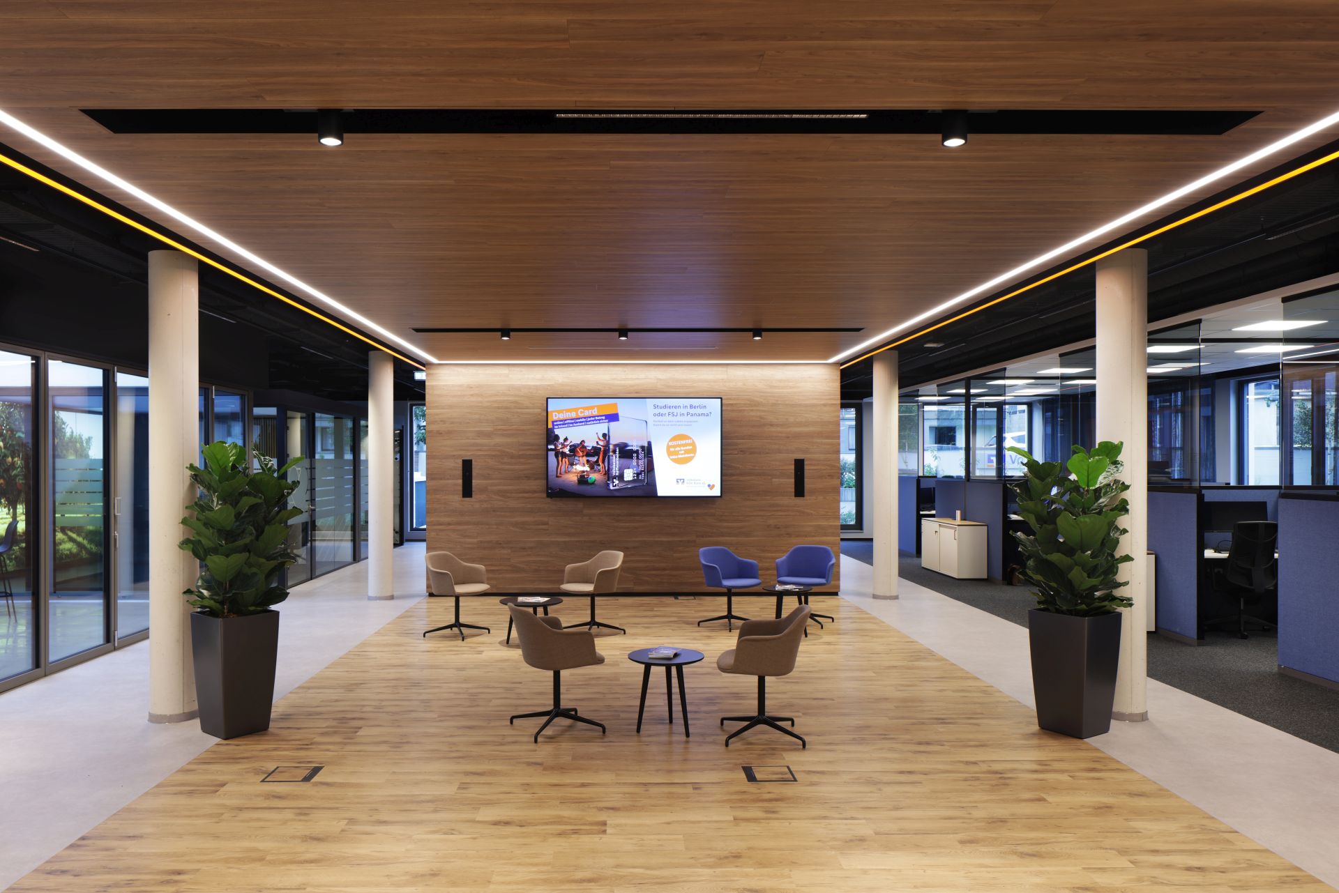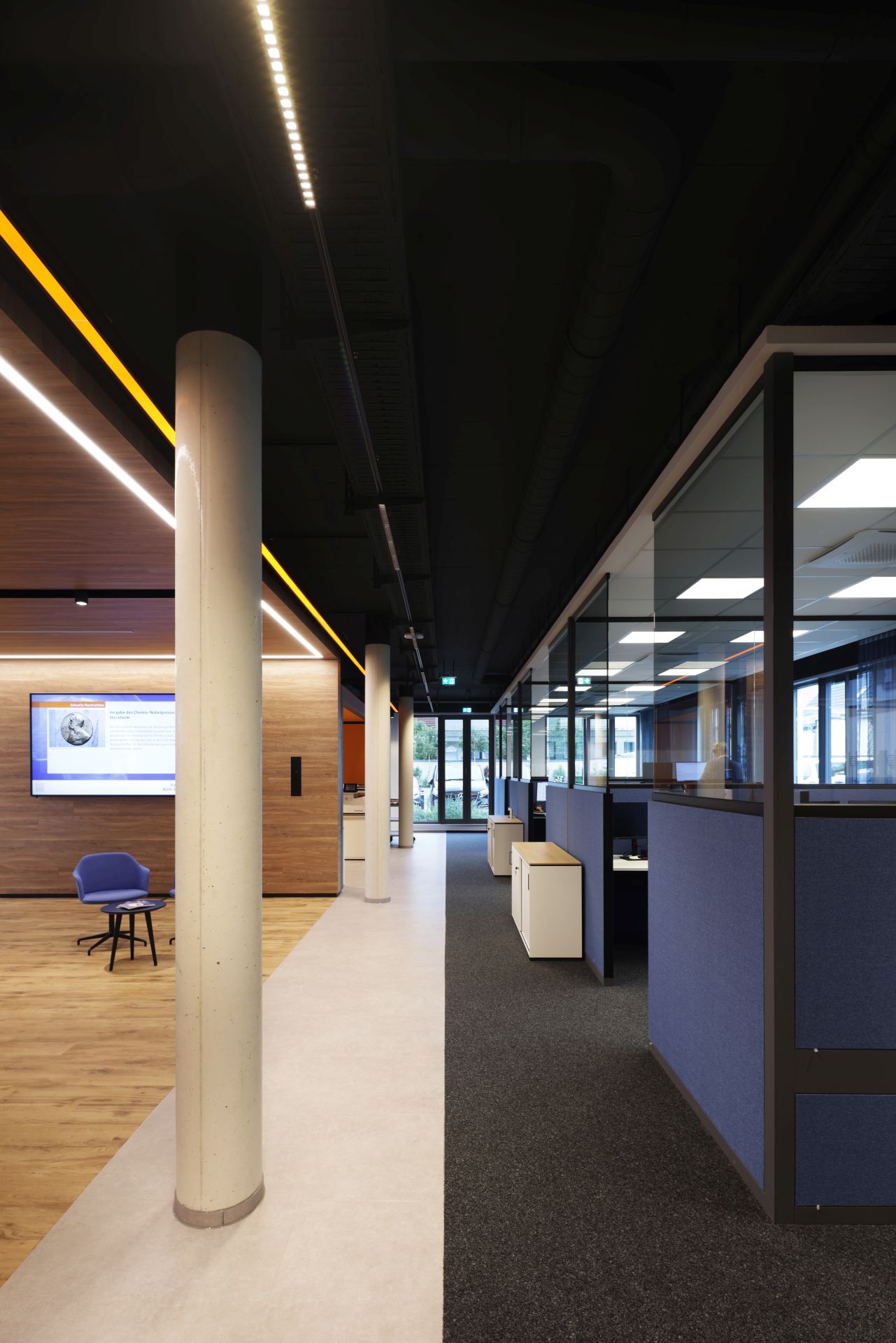 Auch für die Mitarbeiter bedeutet das neue Konzept einen deutlichen Wandel: Statt in abgeschlossenen Büros arbeiten sie in offenen, gemeinschaftlich genutzten Bereichen, die Kommunikation und Zusammenarbeit fördern.
