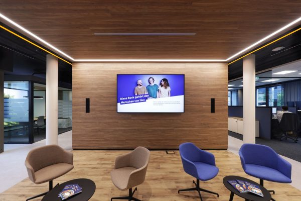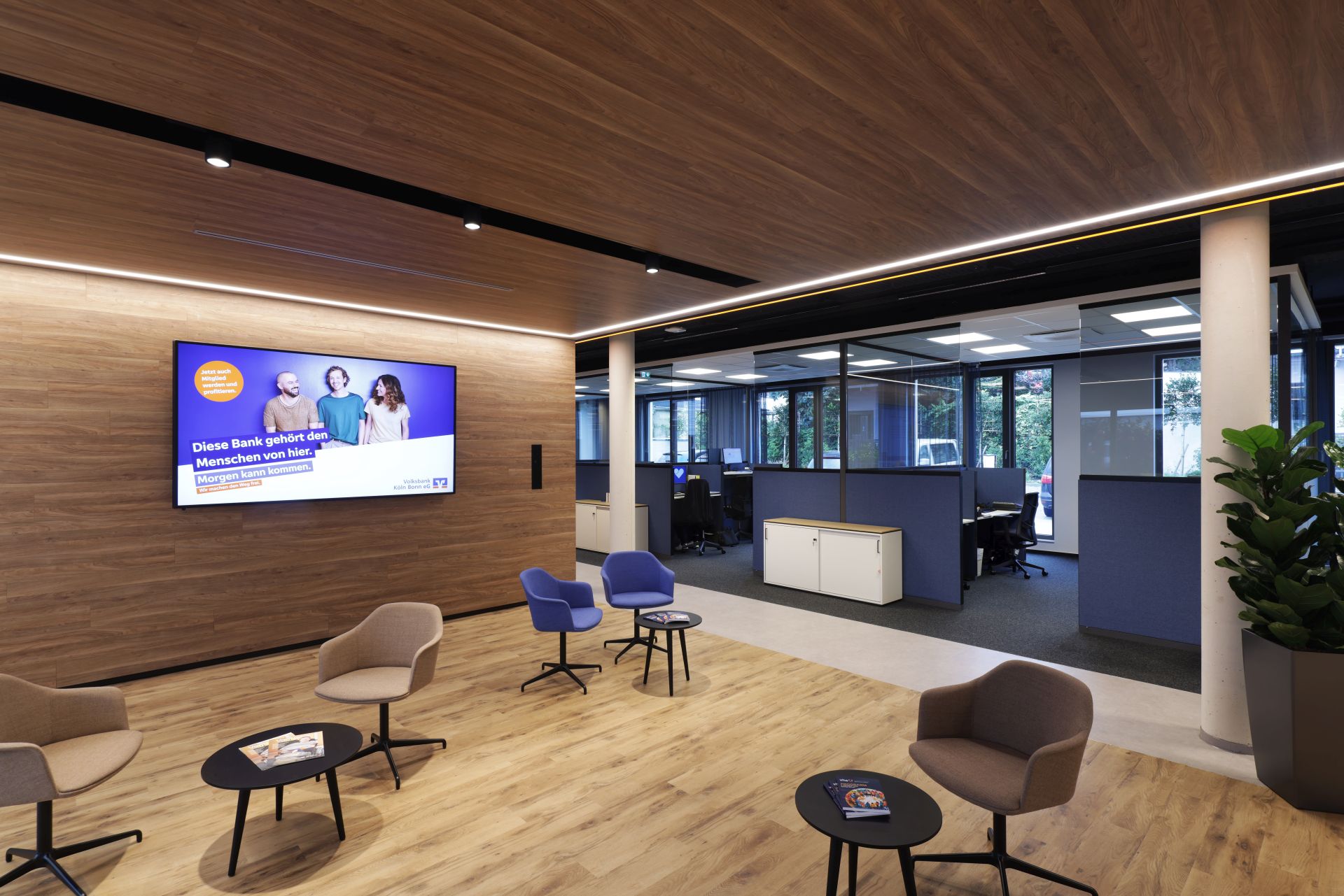 Das Ergebnis ist eine einladende Atmosphäre, die Funktionalität und Wohlfühlen verbindet, die Marke Volksbank Köln Bonn erlebbar macht und als Vorbild für künftige Filialen dient.